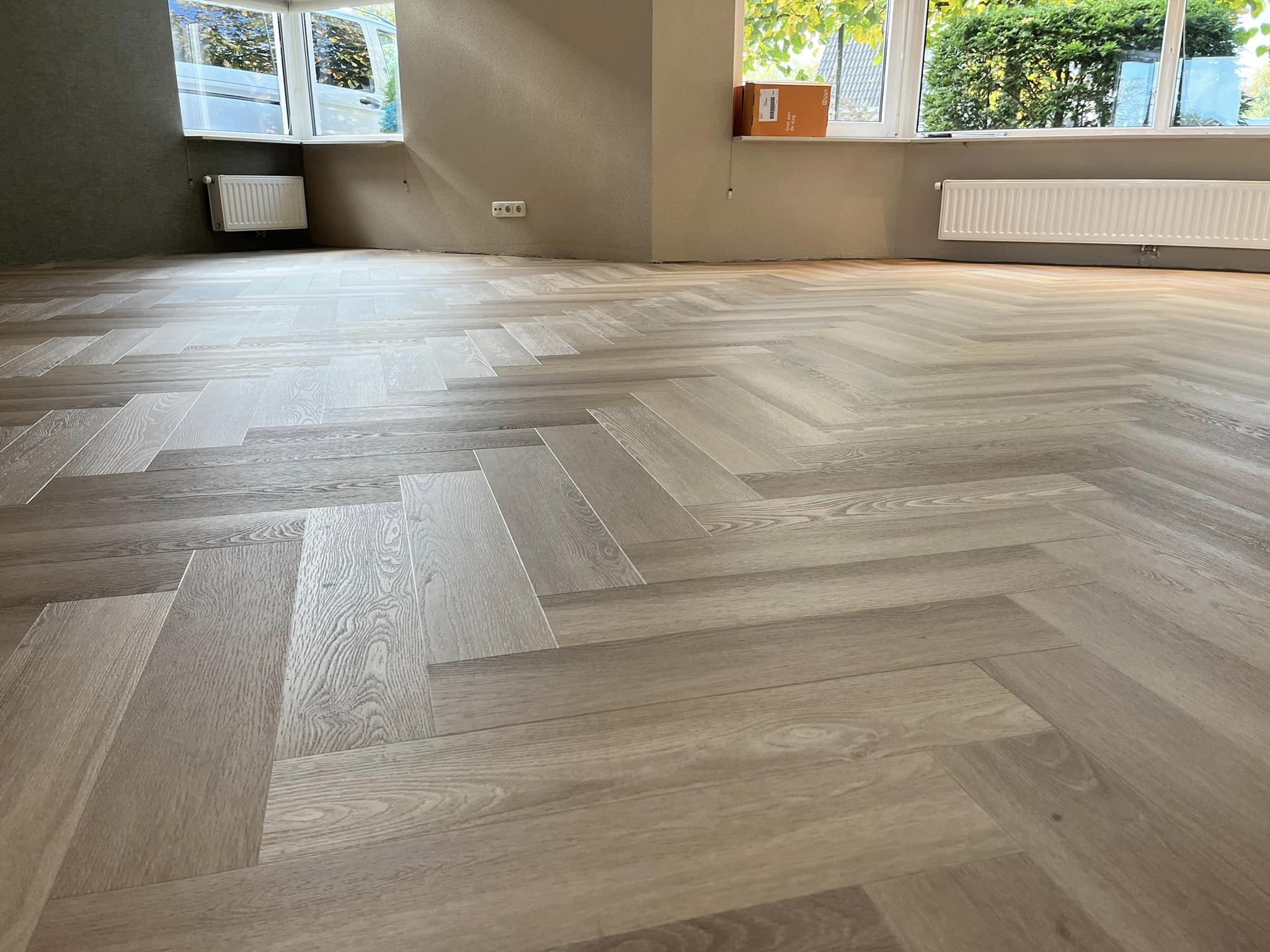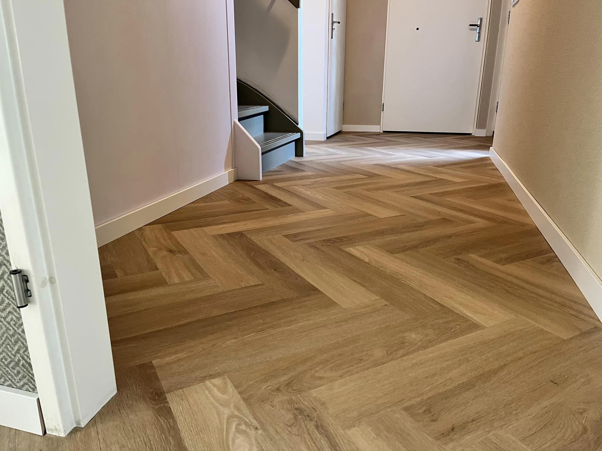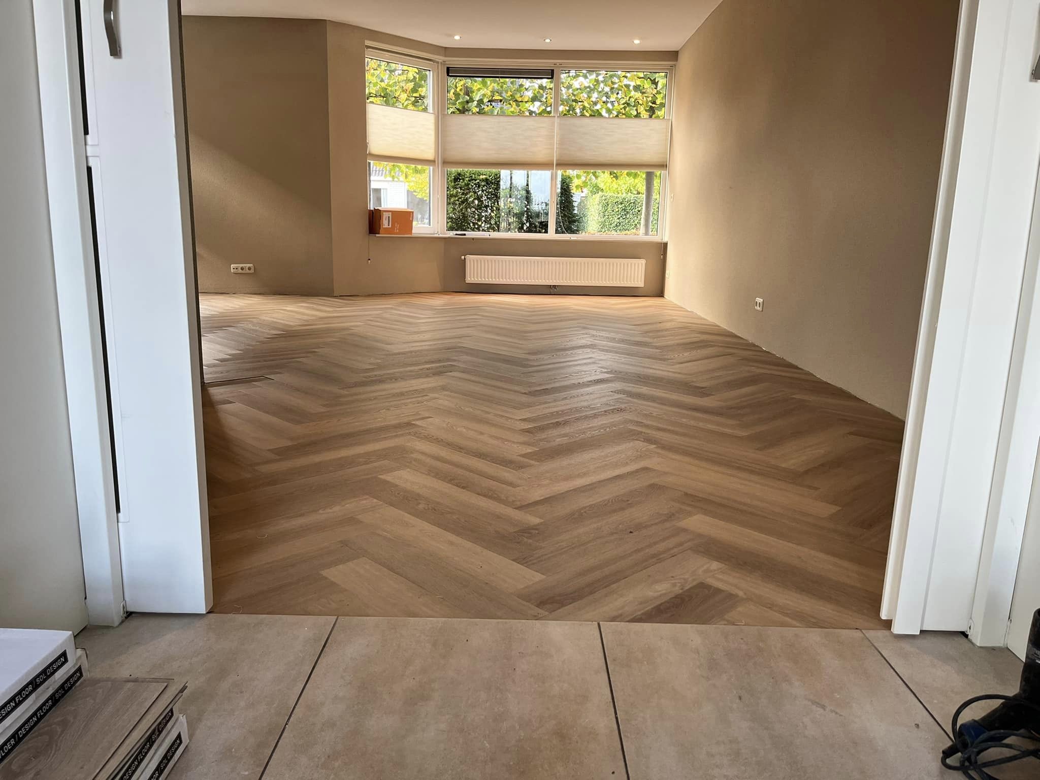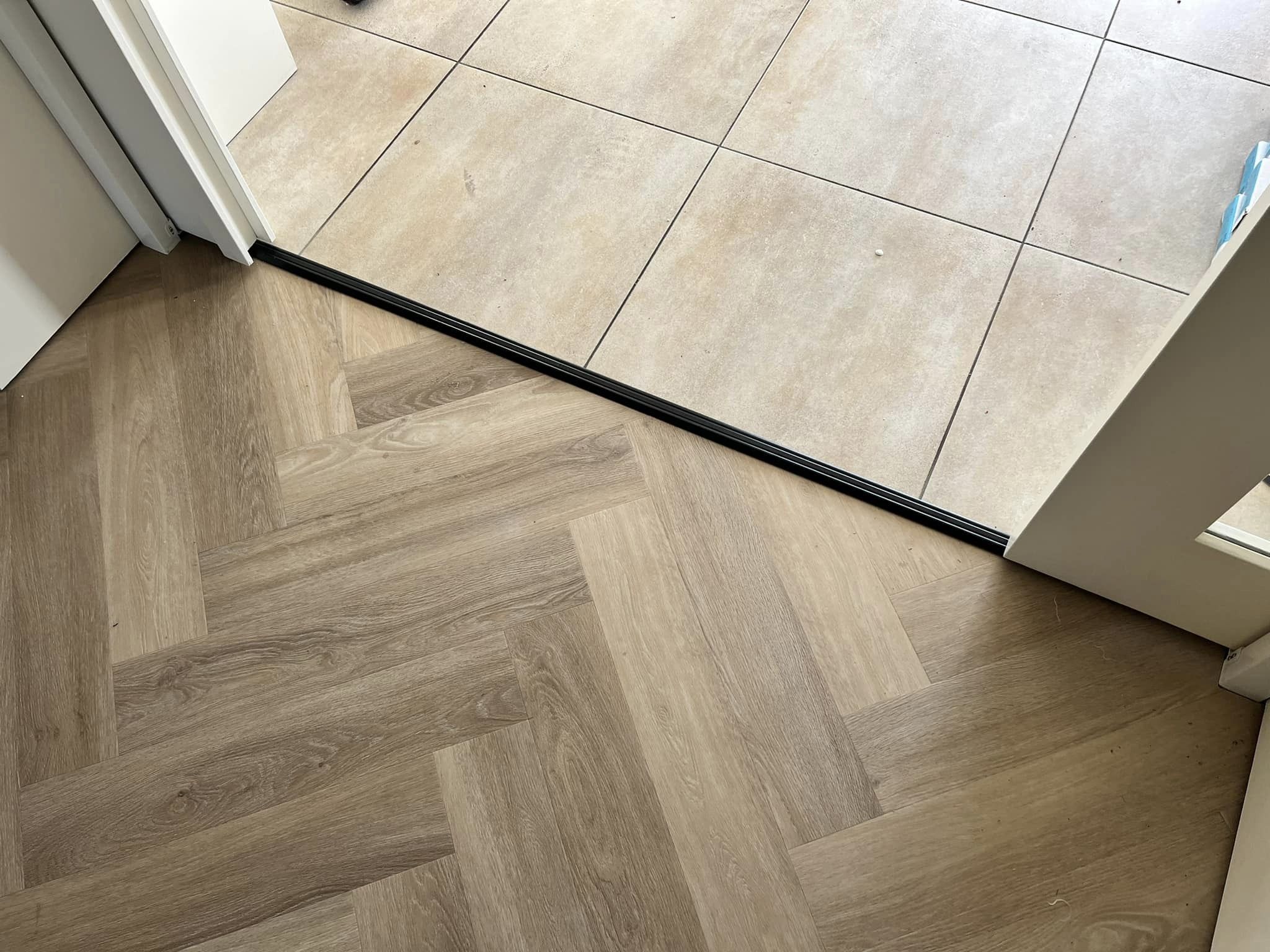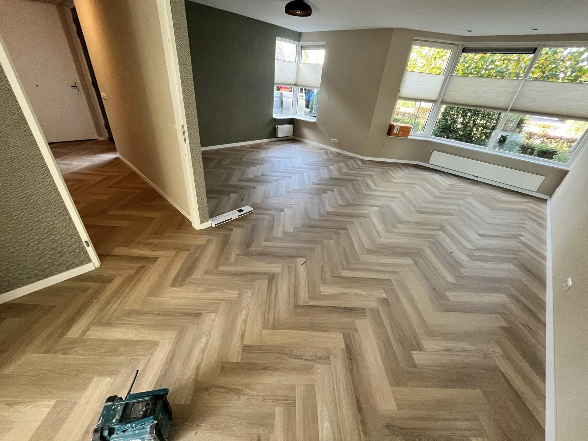 Bij deze woning in slagharen hebben wij deze ijzersterke visgraatvloer van Floorlife mogen leggen. Hier hebben we 5mm geëgaliseerd omwille van oneffenheden in de cementdekvloer en vervolgens een visgraat vloer er overheen gelegd, de overloop van tegel naar PVC hebben we mooi afgewerkt met een strakke overgangsprofiel met tot slot witte MDF plinten (7×15)
